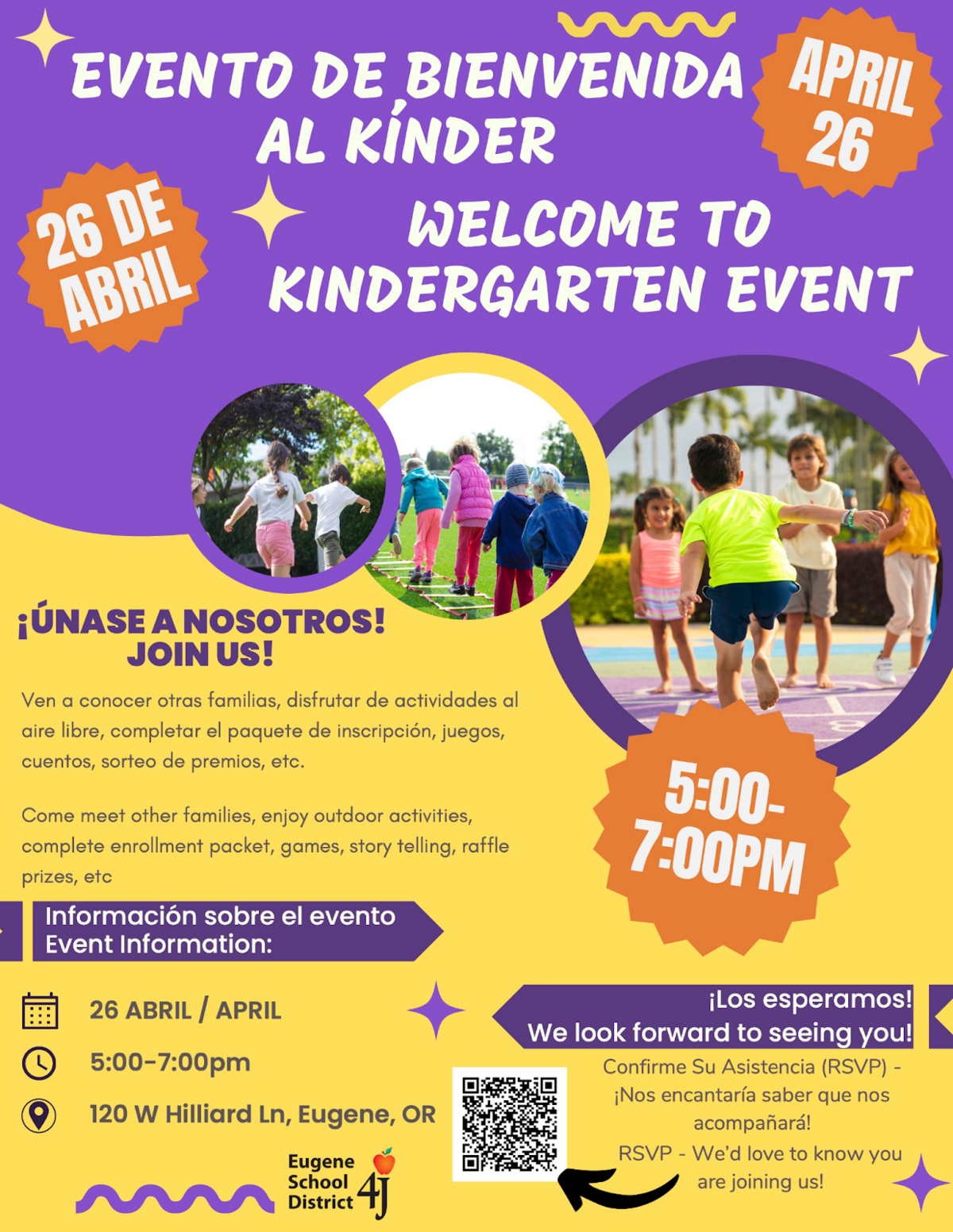 District-Wide Kinder Event – Eugene School District welcomes ALL families who will have an incoming kindergarten student for the 2024/25 school year to join us for a special Welcome to Kindergarten Event on Friday, April 26, 2024, from 5:00-7:00 pm. We invite students and their families to join us for this fun-filled evening. The flyer below has additional information. We hope to see you there!