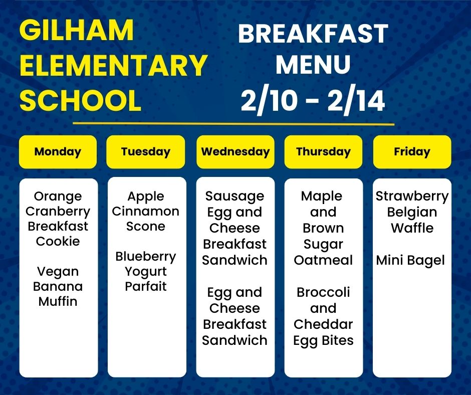 • Breakfast & Lunch Menus – Breakfast and lunch menus are available on the 4J Menu Website. Make sure you filter to Gilham Elementary.
