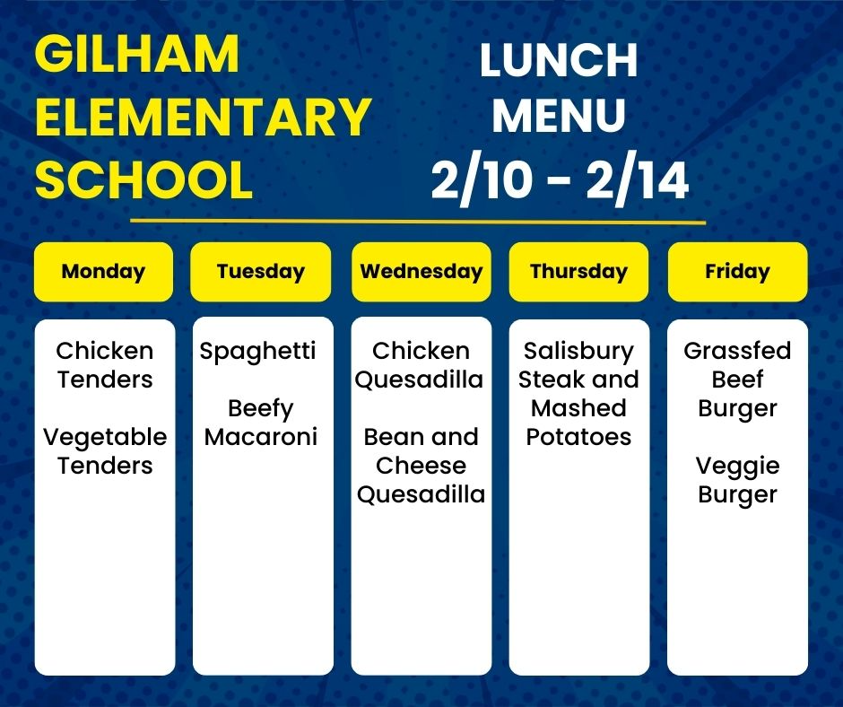 • Menús de desayuno y almuerzo: los menús de desayuno y almuerzo están disponibles en el sitio web de menús de 4J . Asegúrese de filtrar por Gilham Elementary.