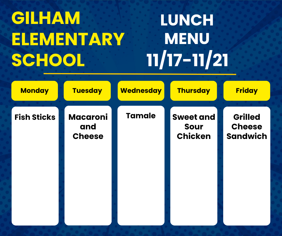 •Menús de desayuno y almuerzo: Los menús de desayuno y almuerzo están disponibles en el sitio web de menús de 4J . Asegúrese de filtrar por la escuela primaria Gilham.