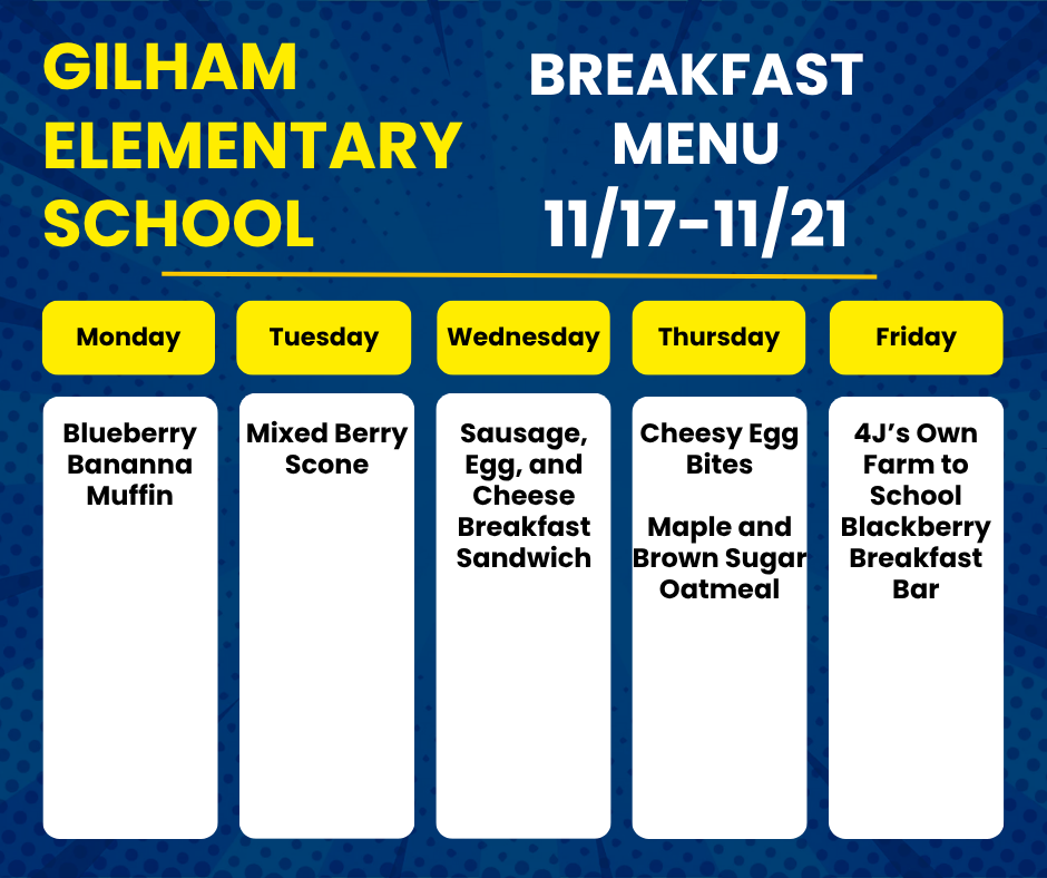 •Breakfast & Lunch Menus – Breakfast and lunch menus are available on the 4J Menu Website. Make sure you filter to Gilham Elementary.