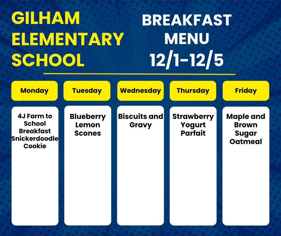 •Breakfast & Lunch Menus – Breakfast and lunch menus are available on the 4J Menu Website. Make sure you filter to Gilham Elementary.