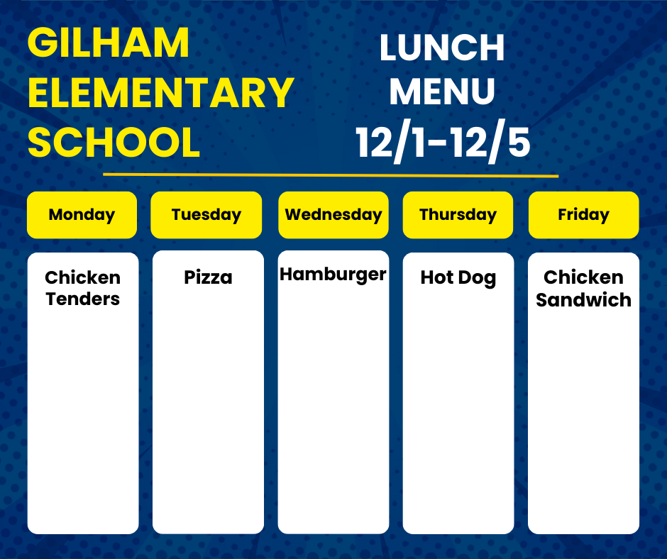 Menús de desayuno y almuerzo: Los menús de desayuno y almuerzo están disponibles en el sitio web de menús 4J . Asegúrate de filtrar por la Escuela Primaria Gilham.