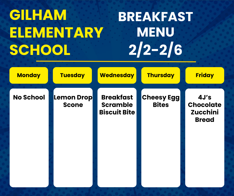 •Breakfast & Lunch Menus – Breakfast and lunch menus are available on the 4J Menu Website. Make sure you filter to Gilham Elementary.