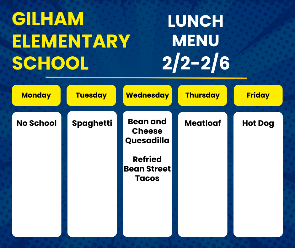 Menús de desayuno y almuerzo: Los menús de desayuno y almuerzo están disponibles en el sitio web de menús 4J . Asegúrate de filtrar por la Escuela Primaria Gilham.
