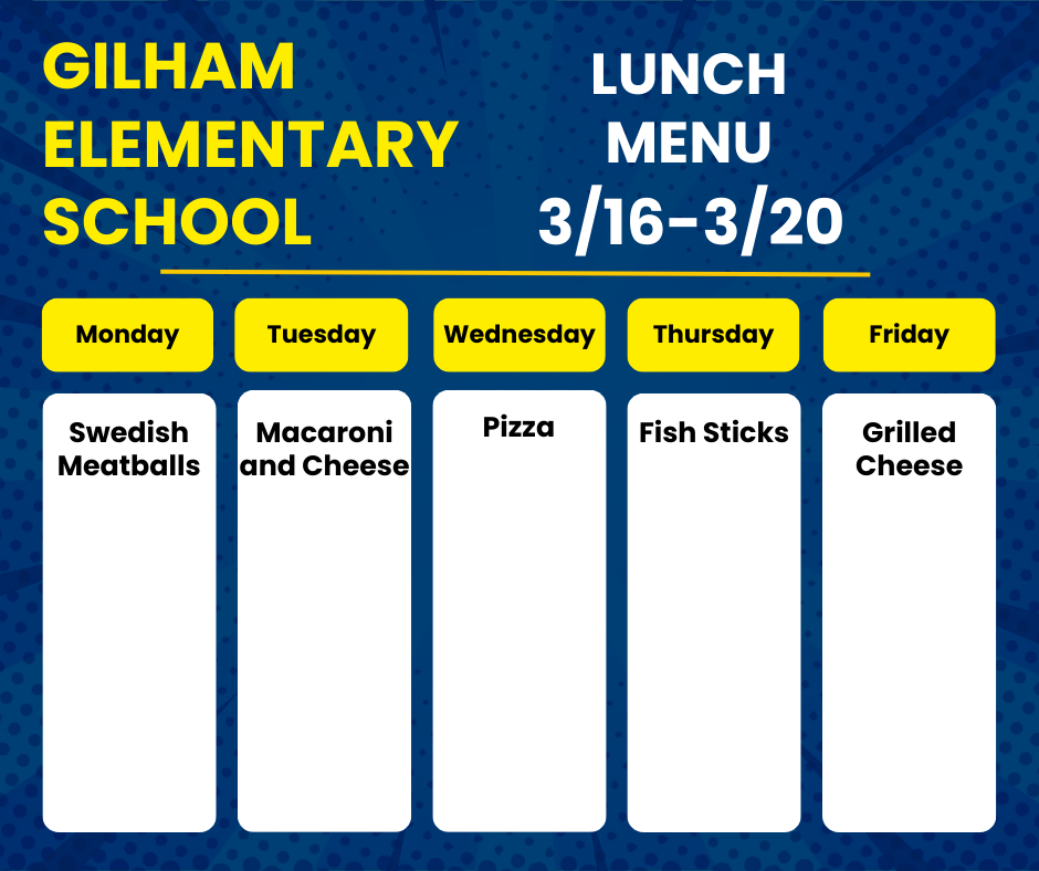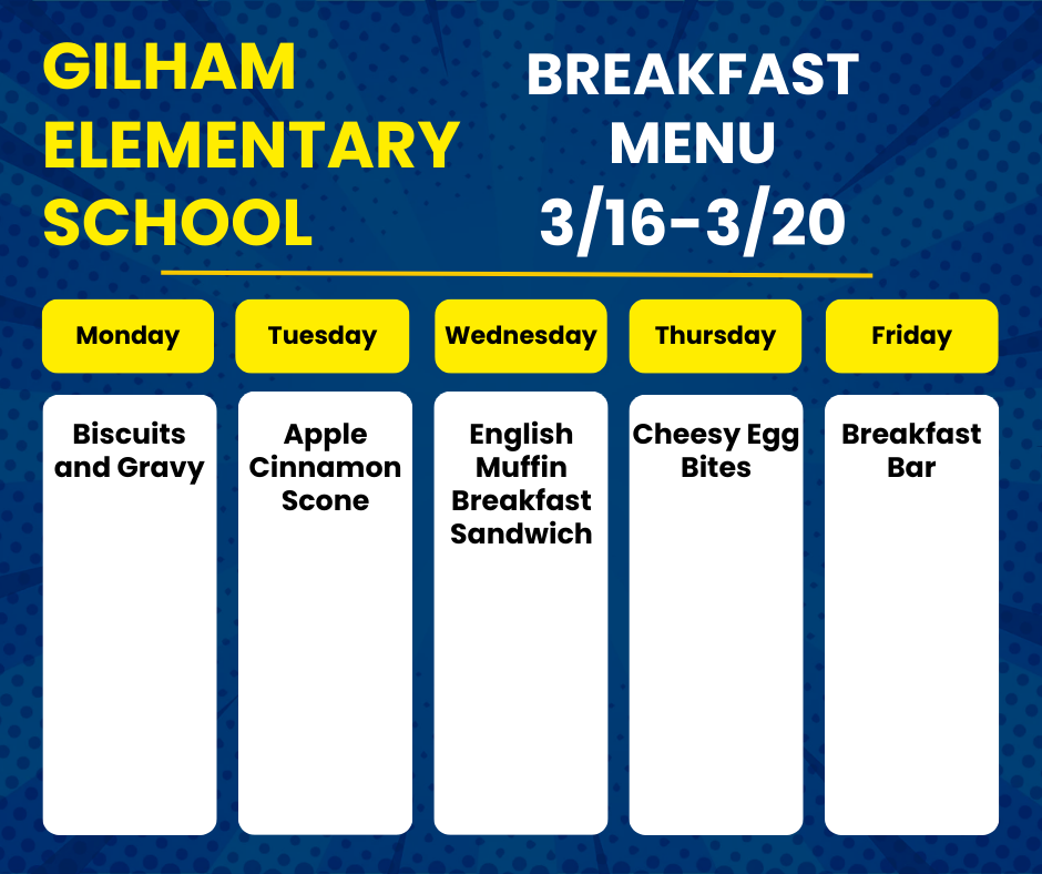 • Menús de desayuno y almuerzo: Los menús de desayuno y almuerzo están disponibles en el sitio web de menús de 4J . Asegúrese de filtrar por la escuela primaria Gilham.