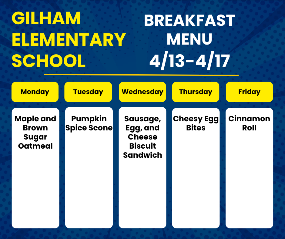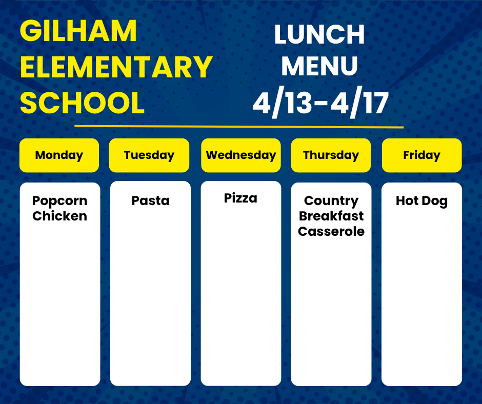 • Menús de desayuno y almuerzo: Los menús de desayuno y almuerzo están disponibles en el sitio web de menús de 4J . Asegúrese de filtrar por la escuela primaria Gilham.