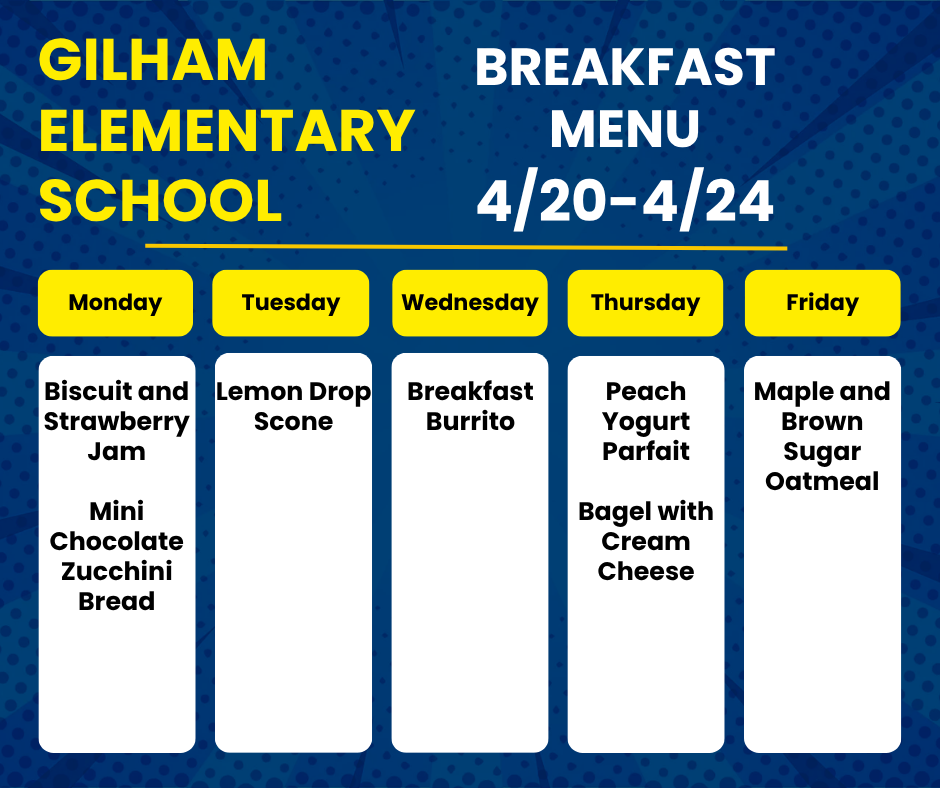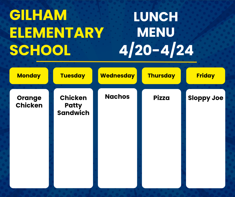 • Menús de desayuno y almuerzo: Los menús de desayuno y almuerzo están disponibles en el sitio web de menús de 4J . Asegúrese de filtrar por la escuela primaria Gilham.