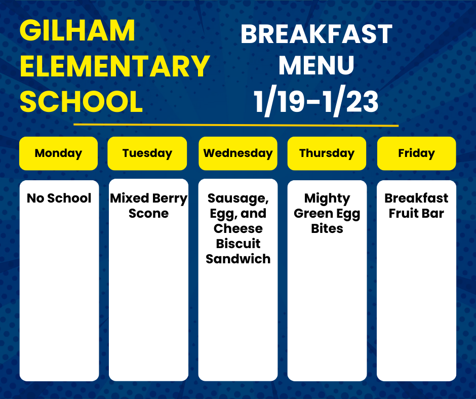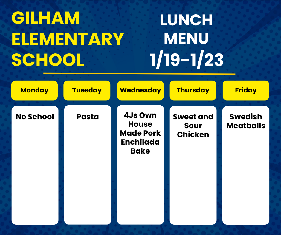 • Menús de desayuno y almuerzo: Los menús de desayuno y almuerzo están disponibles en el sitio web de menús 4J . Asegúrate de filtrar por la Escuela Primaria Gilham.